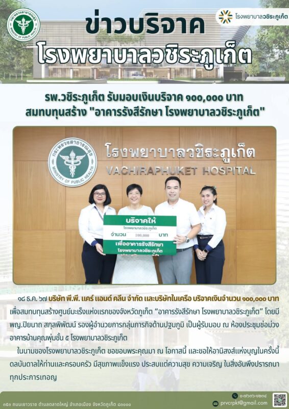 เมื่อวันที่ 18 ธ.ค.67 บริษัท พี.พี. แคร์ แอนด์ คลีน จำกัด และบริษัทในเครือ ได้ร่วมบริจาคเงินจำนวน 100,000 บาท เพื่อสมทบทุนสร้างศูนย์มะเร็งแห่งแรกของจังหวัดภูเก็ต “อาคารรังสีรักษา โรงพยาบาลวชิระภูเก็ต” โดยมี พญ.ปิยนาถ สกุลพิพัฒน์ รองผู้อำนวยการกลุ่มภารกิจด้านปฐมภูมิ เป็นผู้รับมอบ ณ ห้องประชุมช่อม่วง อาคารบ้านคุณพุ่มชั้น 5 โรงพยาบาลวชิระภูเก็ต