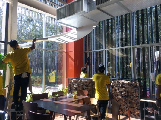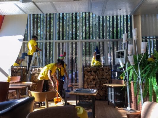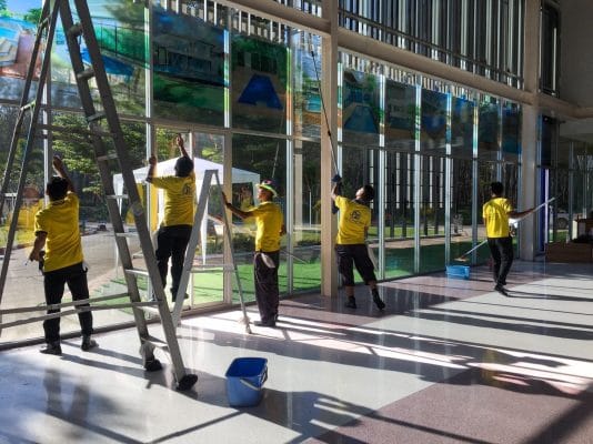 จากรูปจะเห็นว่า การทำงานของเราคือการแบ่งทีมงาน 3 ชุด พนักงานชุดที่ 1 เช็ดทำความสะอาดด้านบน ชุดที่ 2 เช็ดทำความสะอาดกระจกด้านล่าง ส่วนชุดที่ 3 ไล่เช็ด ไล่เก็บตามขอบกระจก และพื้น ตามหลังกัน เพื่อรวดเร็วและความสะอาดในทุกๆ งาน จะต้อง อีก 1 ชุด จำเป็นต้องมีพนักงานเก็บรายละเอียดงาน